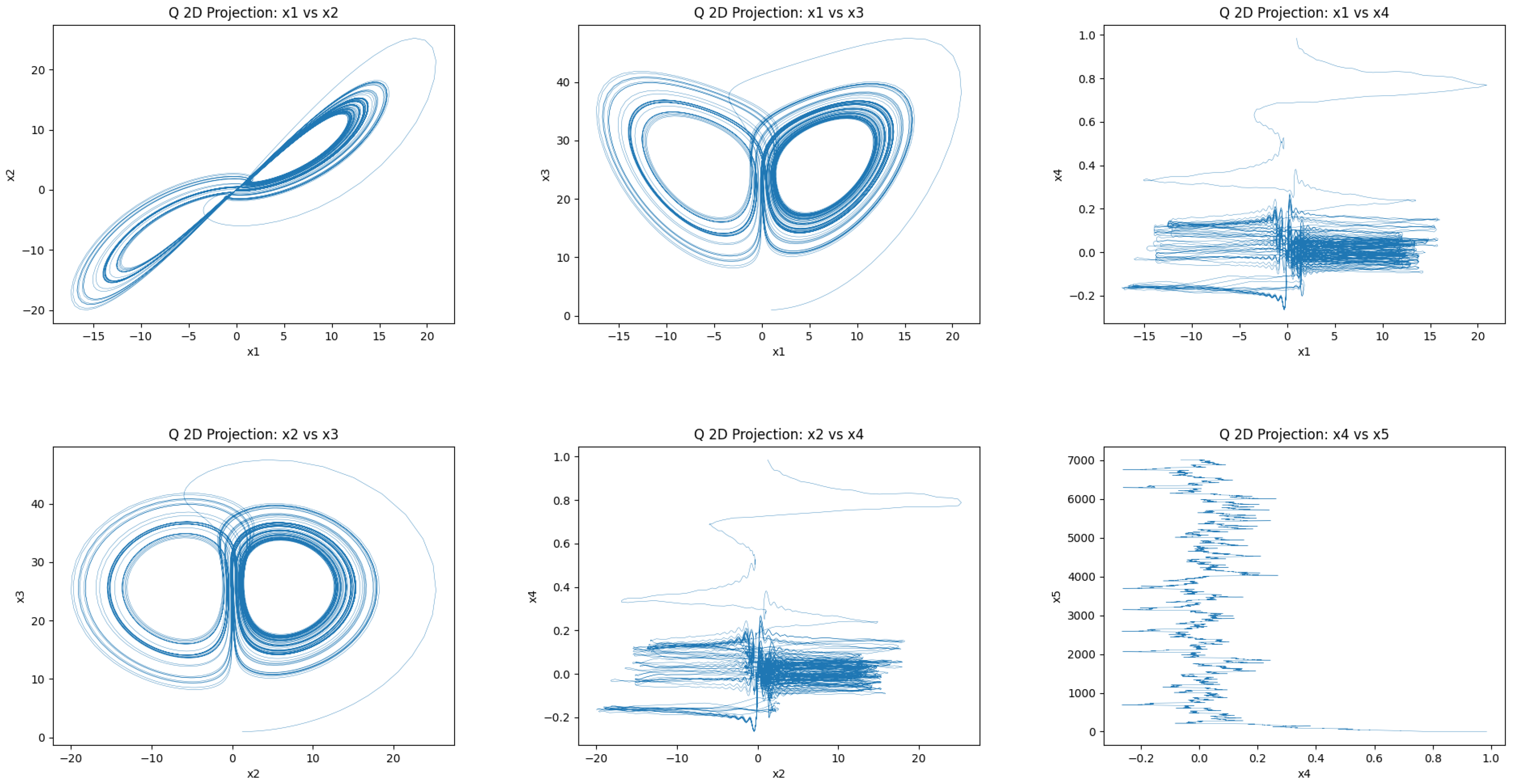 - Custom 5D Hyperchaotic System: A high-dimensional system designed for this study to test scalability and performance in a hyperchaotic regime. It is defined bywhich is constructed by embedding a Lorenz-like core into a 5D structure with nonlinear interactions and auxiliary feedback states. This model yields multiple positive Lyapunov exponents and high-dimensional attractors.