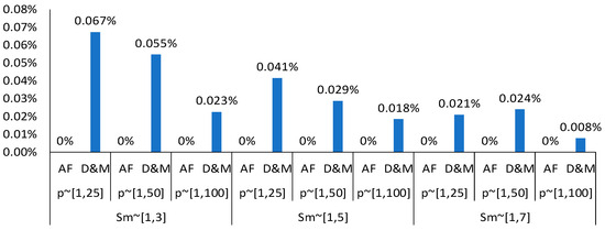 Table 4 clearly shows that the AF formulation achieves the optimal solution across all instances. In contrast, the D&M formulation finds the optimal solution only in cases with 20 jobs or fewer. For instances with more than 20 jobs, such as m = 10, n = 30 or m = 5, n = 25, the D&M formulation fails to reach optimality across all slowness and processing time intervals. In the case where m = 3, n = 30, with a ratio n/m = 10, the D&M formulation demonstrates better performance by achieving optimality in certain combinations of slowness and processing time intervals such as Sm ~ [1,3] with p ~ [1,25], and Sm ~ [1,7] with both p ~ [1,25] and p ~ [1,100]. Figure 7 illustrates the percentage of the average optimality gap for both the AF and D&M formulations across each interval of slowness and processing time. The figure shows that the AF formulation consistently achieves an average gap of 0%, while the average gap for the D&M formulation ranges from 0.008% to 0.067%. Although this gap is small, it highlights that D&M falls short of AF’s performance, particularly in instances with a larger number of jobs.