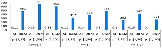 The arc flow formulation demonstrates a significant advantage in terms of both consistency and efficiency as the problem size increases. Unlike the D&M formulation, which struggles and often reaches the maximum time limit. The arc flow formulation maintains a remarkable level of performance. Even in more challenging scenarios where the number of jobs is 20 or more and the ratios of n/m reach 3 or 5, the arc flow formulation efficiently solves every instance in less than 4 s. This consistent efficiency highlights the robustness of the arc flow approach, making it a preferable choice for large and complex problem instances where minimizing computational time is crucial. The overall average CPU time for every pair of slowness interval and processing time interval also demonstrates the superior performance of the arc flow formulation compared to the D&M formulation. The highest average computational time recorded for the AF formulation is less than 0.5 s, whereas the average CPU time for the D&M formulation ranges from 252.45 to 658.92 s. The average CPU time is presented graphically as shown in Figure 8.
