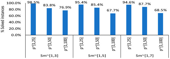 From the results presented in Table 6, it is obvious that the arc flow formulation can optimally solve instances comprising up to 60 jobs across all combinations of slowness and processing time intervals. However, as both the total jobs and the ratio n/m increase, the efficiency of the AF formulation in solving all instances gradually declines. Out of a total of 360 instances for each ratio n/m = 20 and n/m = 30, the minimum number of solved instances occurs at a ratio of 30, with only 247 instances solved, compared to 300 instances solved when the ratio n/m = 20. The table also shows that, for each slowness interval, the total number of solved instances decreases as the interval of processing time increases, as also shown in Figure 9 with the decreased percentage of solved instances for each value of Sm as the processing time interval increases. The minimum number of solved instances occurs at the largest processing time interval, i.e., p ~ [1,100].