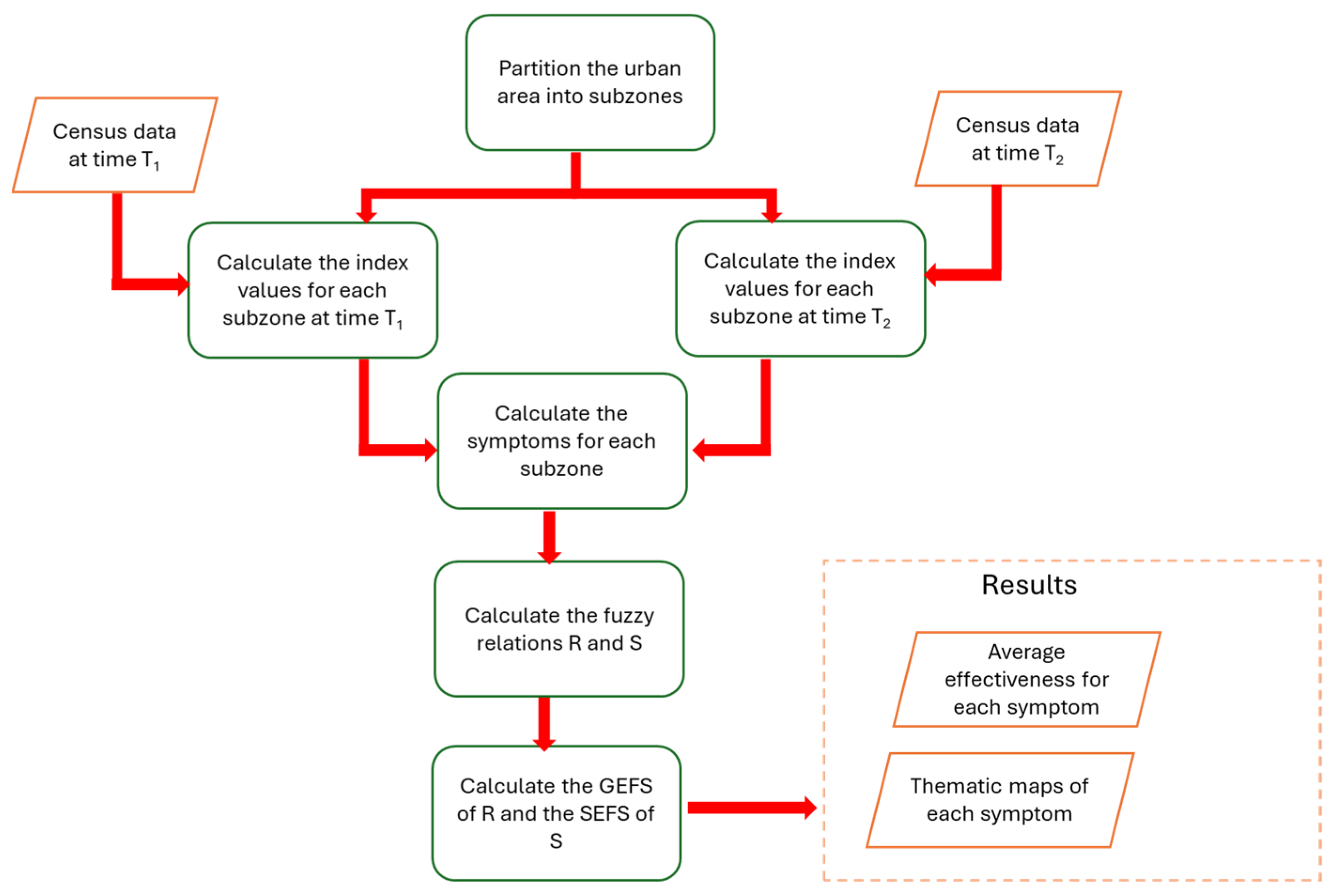 Figure 1 illustrates the model’s architecture. Census data recorded at the start and end of the survey period are acquired and aggregated by subzone. The indices needed to assess growth in citizens’ well-being and quality of life are then calculated. The symptoms are then determined for each subzone and the two fuzzy relations R and S are constructed. Having determined the GEFS of relation R and the SEFS of relation S, the average effectiveness of local policies in manifesting each symptom is established and thematic maps showing the spatial distribution of each symptom are created.