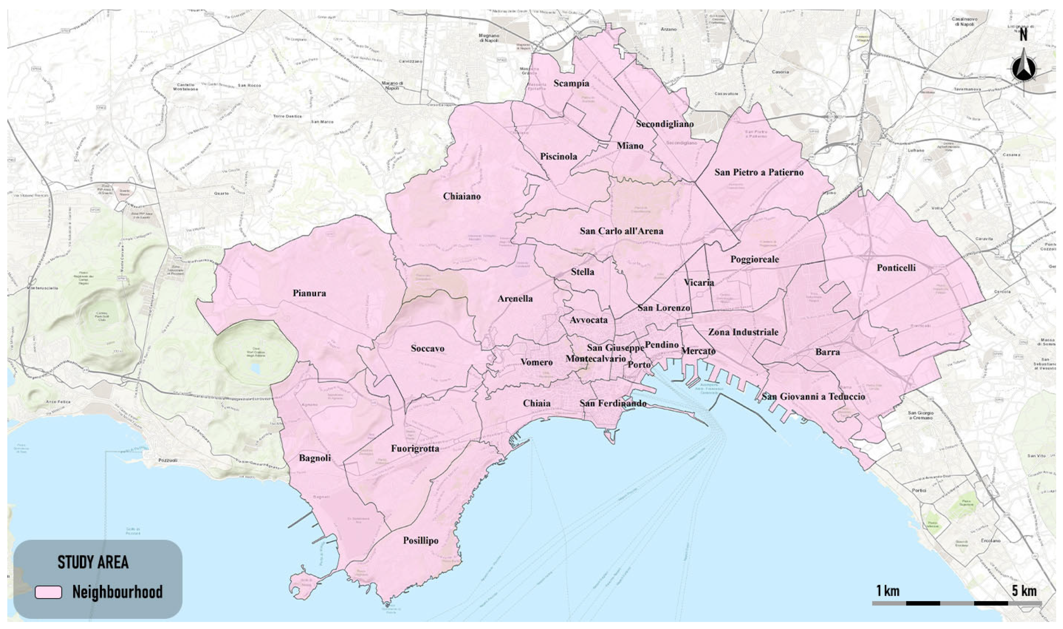 The choice of Naples as a study area is motivated by the fact that its neighborhoods have been characterized by significant differences in the social, cultural, and economic status of their residents. Over the last decade, in line with national and regional directives and regulations, several local policy strategies have been implemented aimed at increasing employment rates and educational attainment, especially in the most disadvantaged neighborhoods.