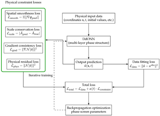 Forward propagation starts with physical input data (including spatial coordinates , time t, and initial conditions). The input is fed into DdONN, where feature mapping and nonlinear transformation are performed through multi-layer phase modulation, ultimately outputting the wavefield prediction result . The loss function adopts a dual-constraint mechanism, including the physical residual loss and the data fitting loss . These two losses are aggregated to form the total loss , ensuring that the model output satisfies both physical laws and observed data. The optimization process optimizes the core parameters of DdONN (phase screen parameters) through backpropagation, forming an iterative training closed-loop of prediction–loss calculation–parameter update until the model converges to a stable state.
