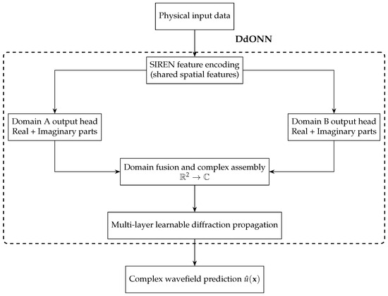 Next, we will introduce the architecture of each module in DdONN-PINNs one by one, including DdONN, SIREN [19] encoding network, domain-specific output heads, domain fusion and complex assembly, multi-layer learnable diffraction propagation, and loss function design.