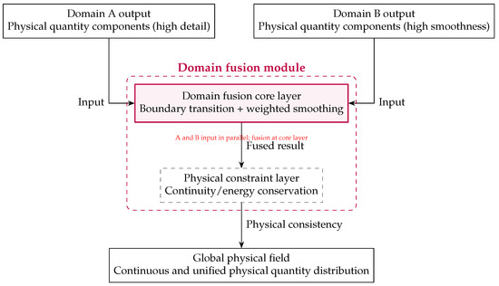 Domain fusion module: Fusion of Domain A (high-detail) and Domain B (smooth) outputs via boundary-weighted smoothing and physical constraints, yielding a continuous global field .