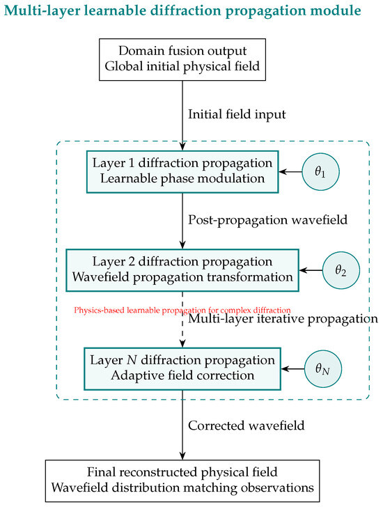 The domain-fusion output is propagated through N learnable diffraction layers. Each layer k applies a parameterized phase screen and a physical diffraction kernel, producing . The cascade progressively corrects unknown perturbations while respecting diffraction physics, yielding a final field that simultaneously fits observations and satisfies conservation laws.