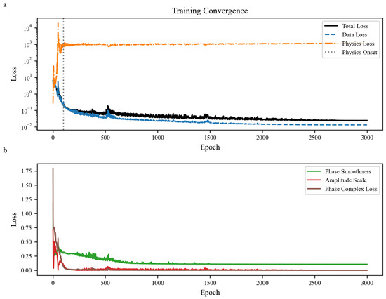 Figure 11b details auxiliary constraints refining physical features. Phase smoothness loss drops rapidly early and stabilizes at ∼0.2, indicating suppression of non-physical fluctuations and recovery of continuous phase gradients (consistent with Figure 10 phase continuity). Amplitude scale loss converges quickly and stabilizes at near-zero, verifying accurate energy conservation. Their rapid convergence reveals hierarchical optimization: phase constraints repair local mutations, amplitude constraints calibrate global energy, jointly supporting physical consistency.