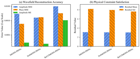 Table 5 and Figure 13 show synergistic effects of activation functions and domain decomposition. For reconstruction accuracy, activation function properties drive significant divergence: ReLUDdONN-PINNs’ Amp MSE is that of DdONN-PINNs and that of NoDdONN-PINNs, as ReLU’s piecewise linearity fails to capture smooth, periodic wavefield variations—introducing large errors in steep-gradient crests and interference details. Phase MSE contrasts are starker: ReLUDdONN-PINNs’ value () far exceeds DdONN-PINNs’ (, lower) and NoDdONN-PINNs’ (, lower), verifying sinusoidal activation’s inherent advantage in modeling phase continuity versus ReLU’s hard saturation, which causes phase jumps even with domain decomposition.