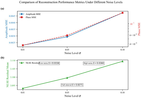 Figure 14 clarifies the trends of these metrics: (a) (blue line) exhibits a monotonic nonlinear increase with noise level , while (red line) rises steadily with , highlighting the inherent sensitivity of phase to noise. The quantified noise sensitivity S (full-interval , low-noise , high-noise ) confirms interval-dependent amplitude error growth, where high-noise sensitivity increases—attributed to the trade-off between domain-specific fitting and noise-induced interference. (b) The mean NLSE residual (green line) shows slight monotonic growth yet remains stable, verifying the effectiveness of constraint mechanisms in suppressing noise-induced error diffusion while maintaining physical consistency.