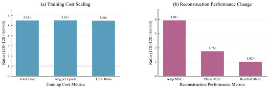 Spatial resolution experiments investigate the effect of scaling spatial resolution (from to , a increase in grid size) on DdONN-PINNs. As shown in Table 9 and Figure 16a, key training cost metrics—total training time, average time per epoch, and time ratio—rise by , outpacing the grid expansion. For reconstruction performance (Table 10 and Figure 16b), amplitude MSE (Amp MSE) increases by (closely matching the resolution scaling), whereas phase MSE () and residual mean () exhibit smaller growth, revealing metric-dependent sensitivity to resolution. Table 11 further demonstrates that DdONN-PINNs adaptively adjust learned parameters (wavelength, center_phi, and edge_phi) to accommodate fine-grained structures at higher resolutions.