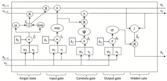The Stable Long Short-Term Memory Network (sLSTM) [19] enhances the performance of traditional LSTMs in tasks such as storage decision-making, rare word prediction, modeling complex dependency, and robustness during training and inference through its introduction of exponential gating, memory mixing, and stabilization mechanisms. The model’s mathematical formulation is provided in [19]; its architecture and core equations are described below to facilitate the subsequent discussion of its adaptation for time series prediction. Figure 1 illustrates the sLSTM network architecture.