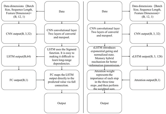 Comparative schematic of the CNN-sLSTM-Attention and CNN-LSTM-FC model architectures.