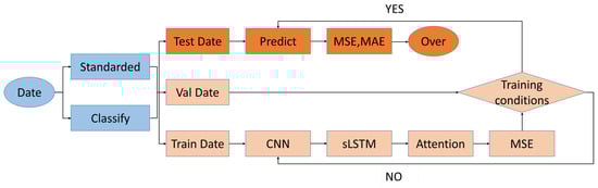 The time series prediction model proposed in this paper represents an adaptation of the CNN-LSTM-Attention architecture [17,21]. Illustrated in Figure 2, the model incorporates convolutional feature extraction, stable sequence modeling (sLSTM), and adaptive attention weighting within a unified framework, enabling the synergistic capture of complex temperature dynamics.