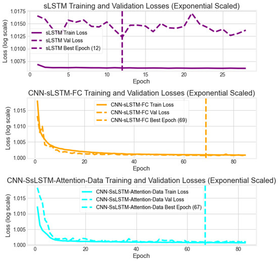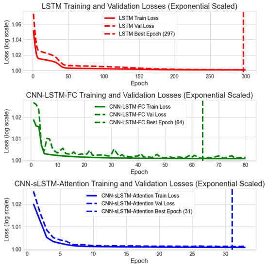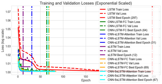Analysis of the exponentially scaled loss curves reveals distinct convergence patterns. The CNN-sLSTM-Attention, CNN-sLSTM-FC, and CNN-SsLSTM-Attention models achieve lower stable loss values more rapidly than other architectures. Specifically, the CNN-sLSTM-Attention model reaches its optimal validation loss around epoch 31, while the CNN-sLSTM-FC and CNN-SsLSTM-Attention models converge around epochs 69 and 67, respectively.