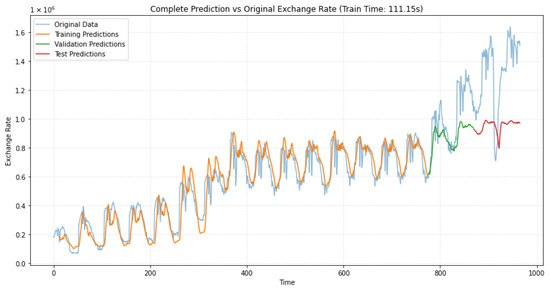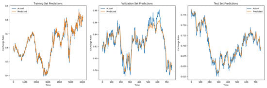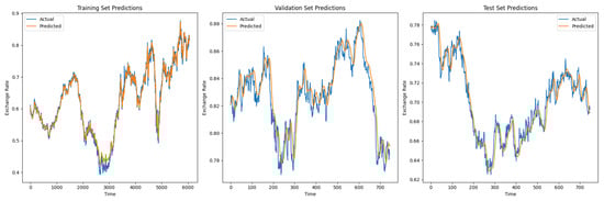 The exchange rate dataset is characterized by random fluctuations with asymmetric peak-valley distributions—a typical phenomenon in financial time series where, for instance, upward peaks are steeper than downward trends in certain periods. Both the CNN-sLSTM-Attention and LSTM models demonstrate good fitting performance on the training and test sets, as shown in Figure 17 and Figure 18, with LSTM producing slightly higher predictions on the test set. However, the LSTM exhibits significant prediction deviations during peak periods in the validation set, whereas the CNN-sLSTM-Attention model captures these peak fluctuations more accurately and shows excellent segment-wise fitting.