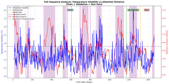 Figure 19 illustrates the relationship between sequence volatility and the model’s attention pattern for the temperature dataset. The blue line represents sequence volatility, calculated using a rolling window standard deviation (5-day windows centered on each point), where higher values indicate greater instability. The red line denotes the attention distance, computed as the Euclidean distance between the current attention weight vector and the average attention pattern across the sequence. Larger distances signify greater deviation from normal patterns, reflecting the model’s sensitivity to anomalous events.