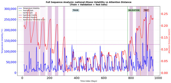 A similar relationship is observed for the national-illness data (Figure 20). Volatility increases during periods 0–400 and 800–1000, with a stable interval between 400 and 800. The attention distance consistently exceeds a threshold of 0.12 during high-volatility phases, particularly during ten significant event periods (e.g., timepoints 12–60, 72–110, 138–162), where the average distance surpasses 0.20. This indicates a strong focus on key transmission nodes. In contrast, attention distance remains low and stable during low-volatility periods. This three-stage attention pattern is consistent with the model’s predictive performance shown in Figure 15, confirming that the attention mechanism successfully adapts to different temporal regimes.