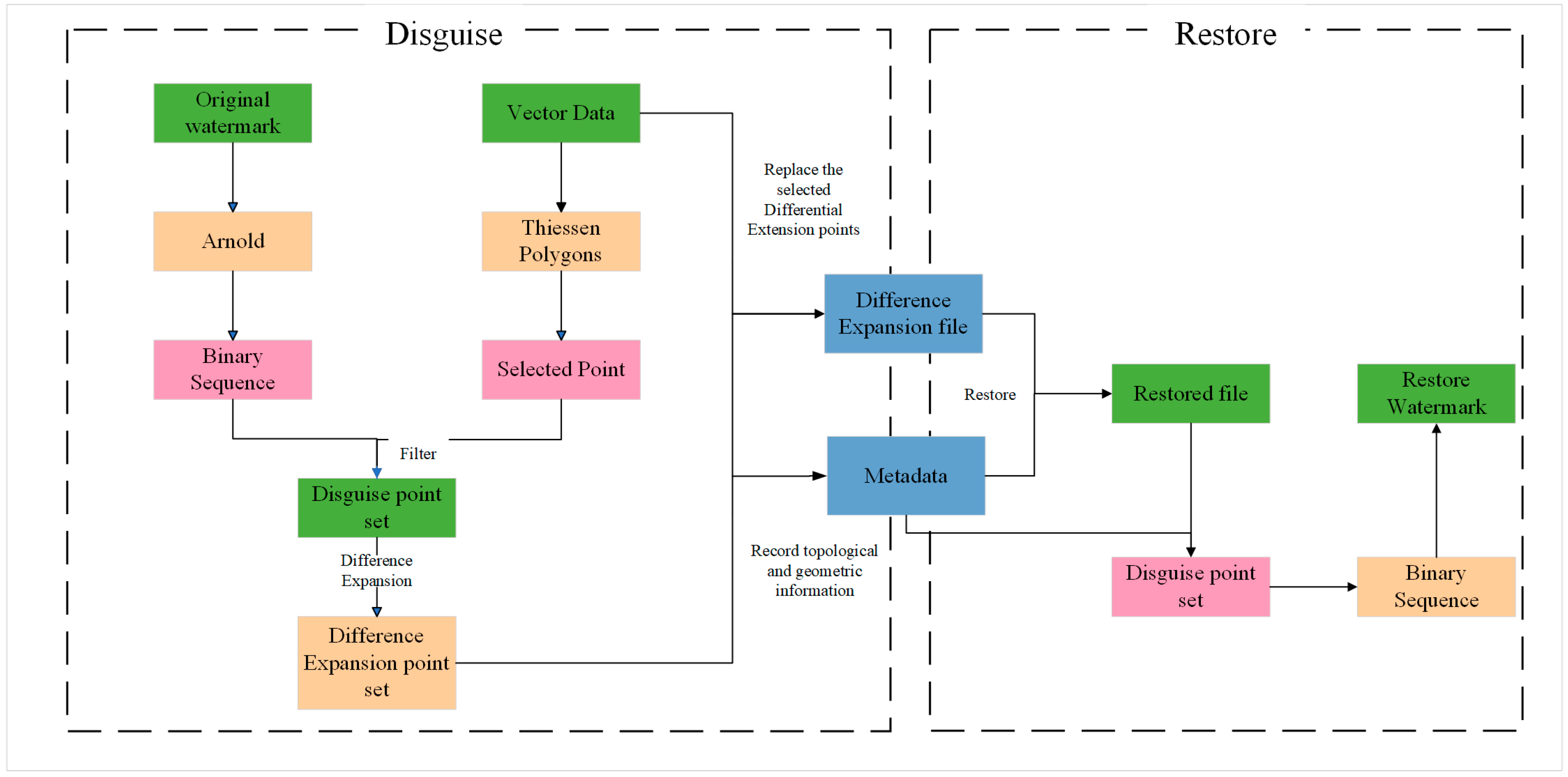 The proposed research framework comprises three main stages. First, the original watermark image is encrypted using the Arnold scrambling method to enhance security. Second, a Voronoi diagram is constructed from the vector geographic data, and feature points requiring difference expansion are selected based on the Voronoi structure. Difference expansion is then applied to these points, and the resulting disguised points are recorded in the metadata. Finally, the vector geographic data are restored from the difference-expanded version, and the disguised points are extracted for watermark recovery. The detailed workflow is illustrated in