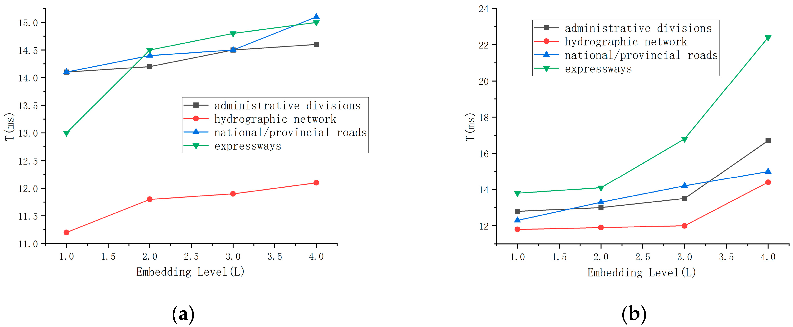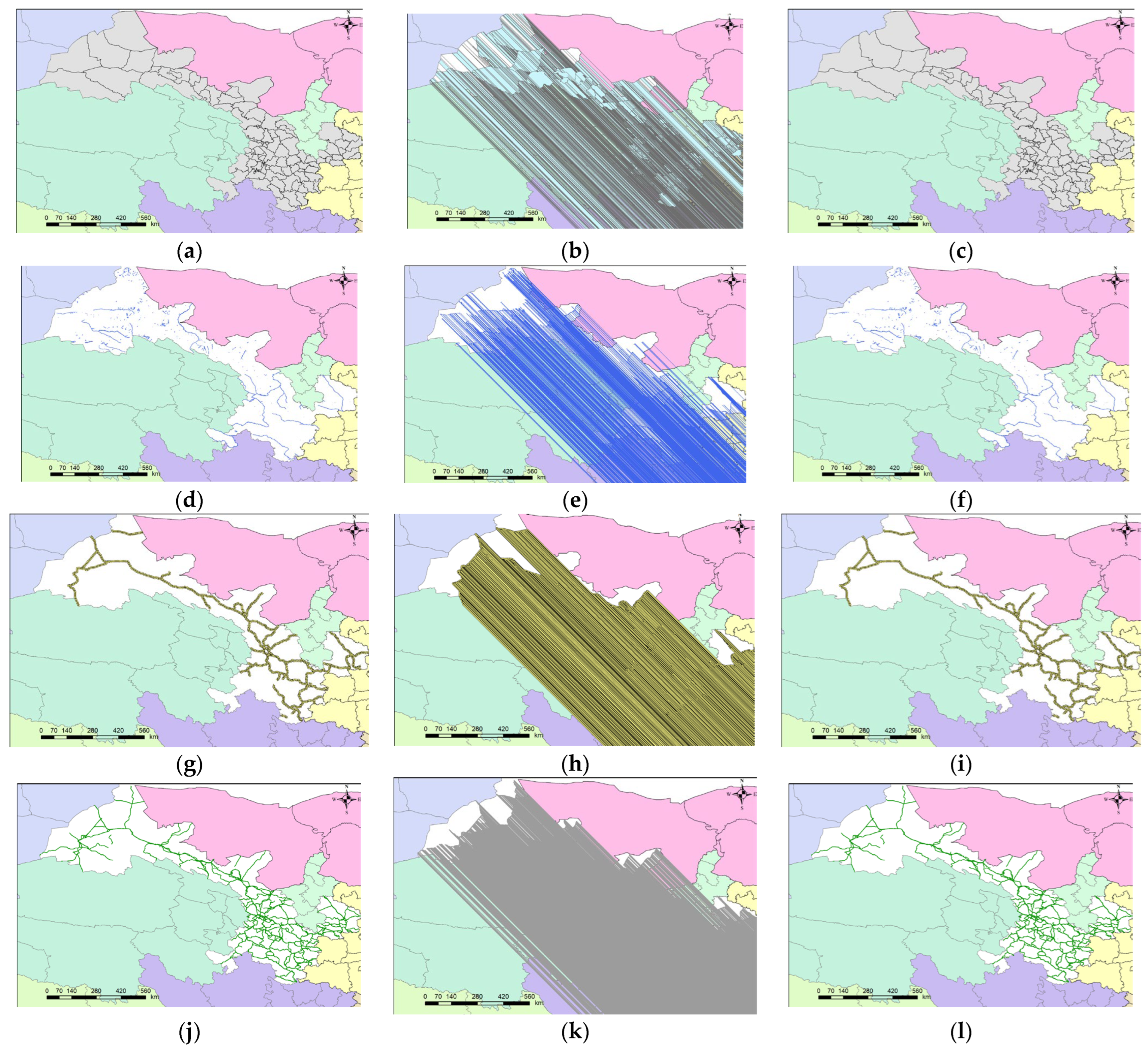 Figure 4 illustrates the visualized results of the difference expansion camouflage applied to the four test layers, namely administrative boundaries, hydrological networks, national and provincial roads, and expressway networks. The visual comparison demonstrates that the embedded modifications are virtually imperceptible at the map scale, preserving the geometric continuity of spatial features while embedding the watermark information.