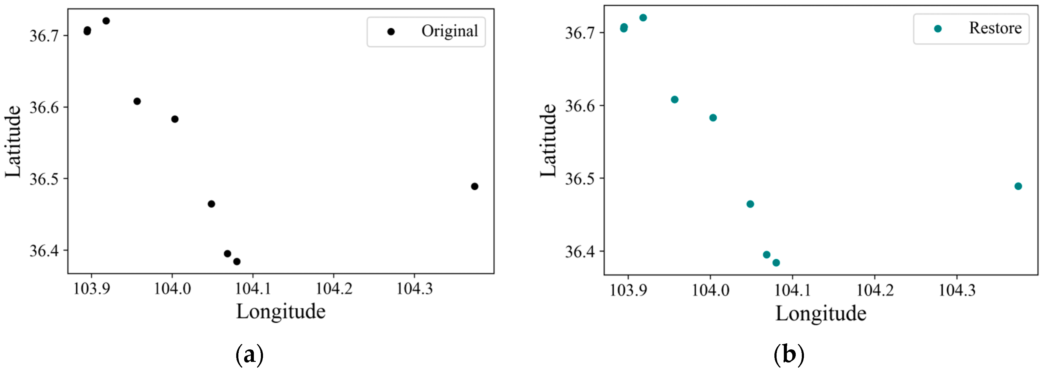Reversibility is a key criterion for evaluating the effectiveness of reversible watermarking algorithms, ensuring that the embedding and extraction processes do not cause permanent alterations to the original data. To assess the reversibility of the proposed method, a coordinate-level encryption–decryption accuracy test was conducted. The procedure involved embedding the watermark into the spatial coordinates of the original vector data, extracting the watermark to restore the coordinates, and then performing a point-by-point comparison between the restored and original coordinates.
