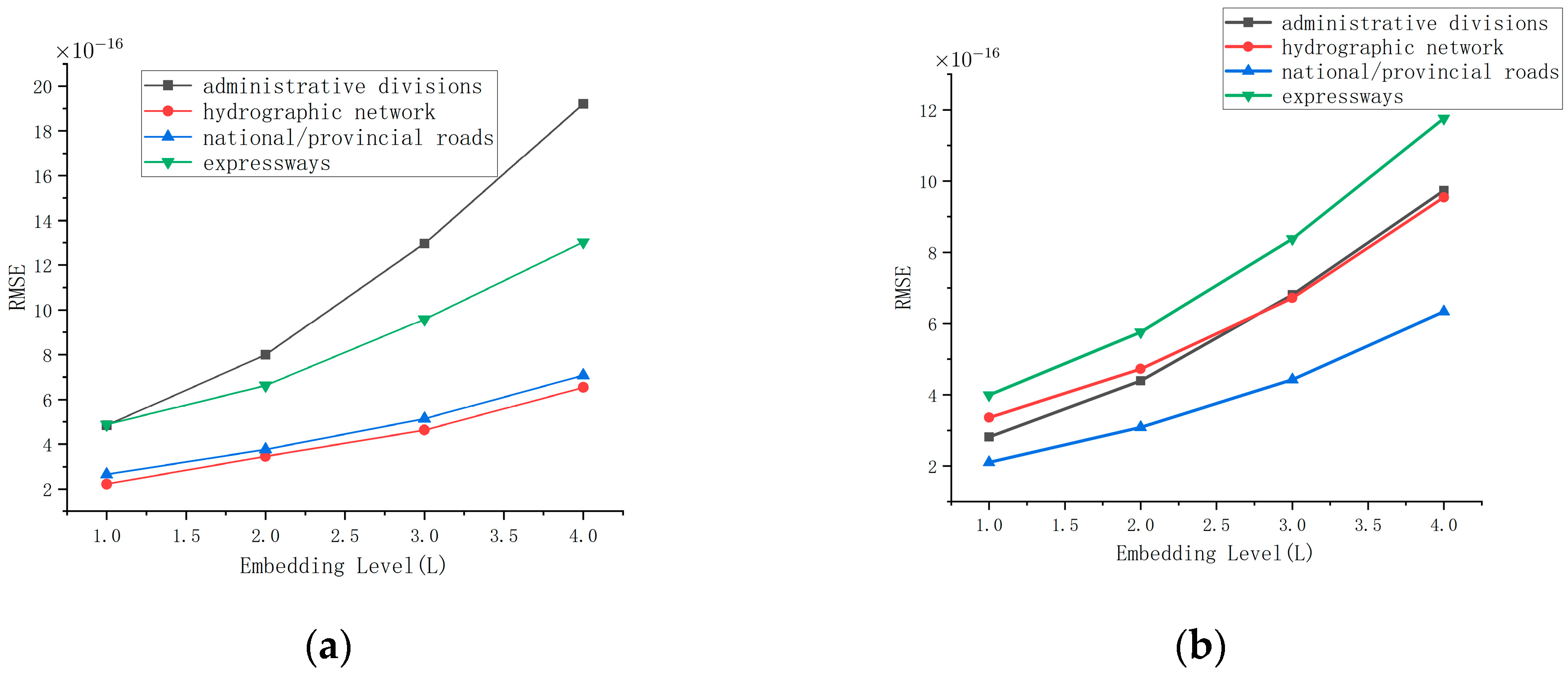 To quantitatively assess the impact of the embedding and restoration processes on vector geospatial data accuracy, RMSE values were computed for two scenarios:
