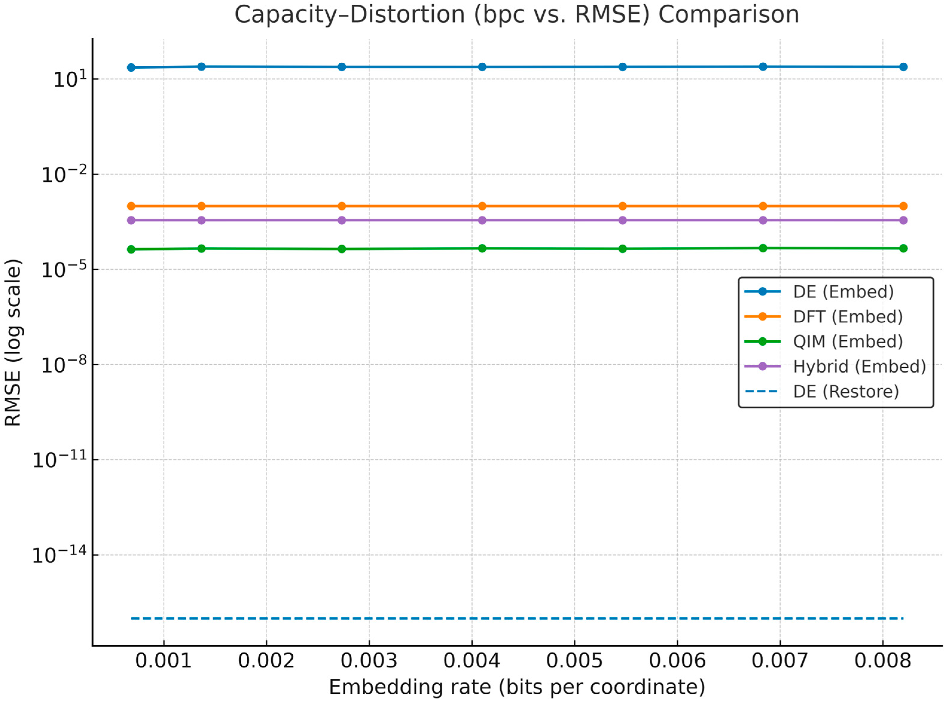 Furthermore, to quantitatively investigate the relationship between embedding capacity and geometric distortion, the Root Mean Square Error (RMSE) was analyzed under varying embedding rates for all four watermarking frameworks (DE, DFT, QIM, and Hybrid).