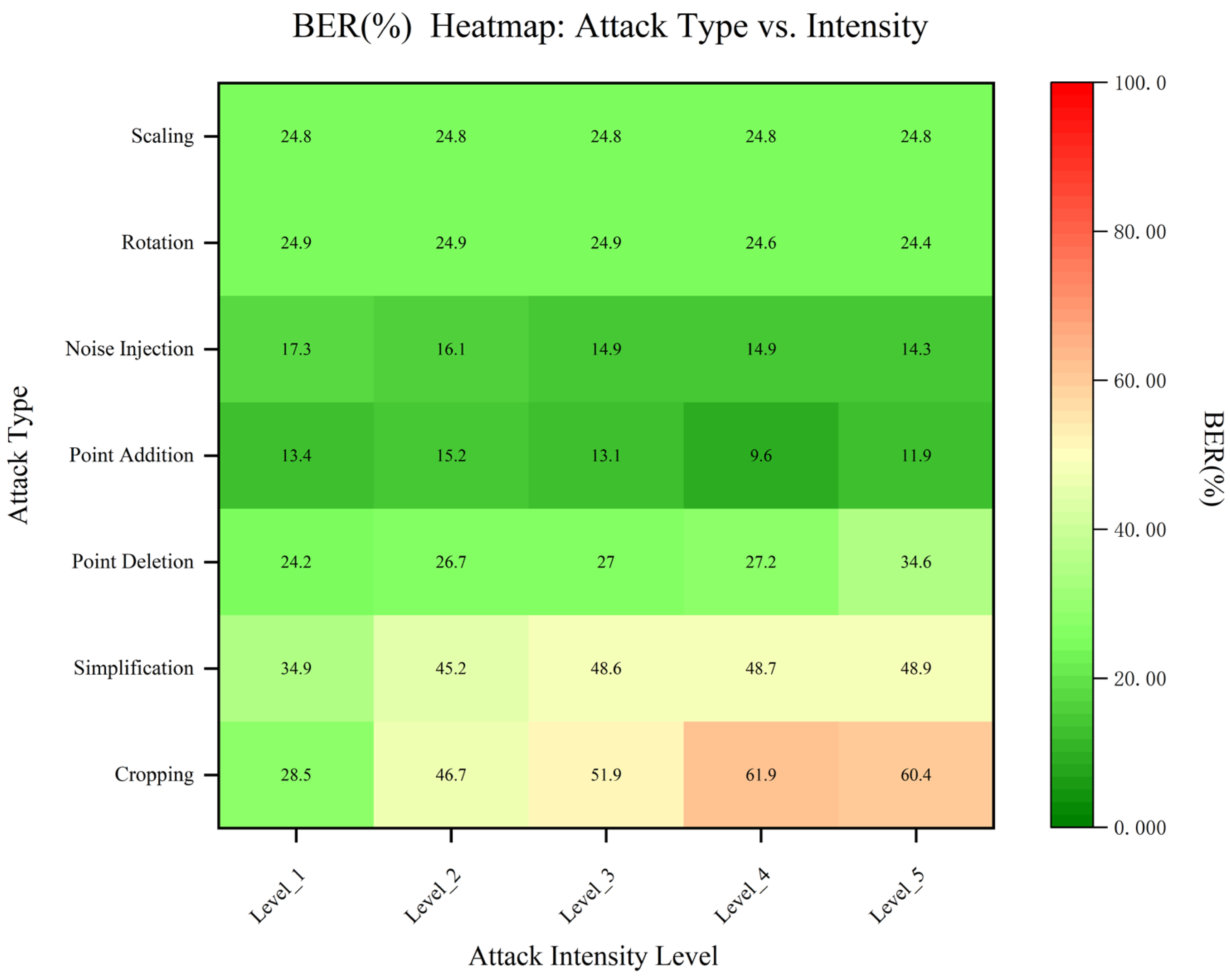 DE achieved strong resilience across all moderate attacks, with BER < 30% in five of seven scenarios (12.64–27.93%). For more destructive distortions such as simplification and cropping, BER increased to ~45–50%, but the extracted watermark images remained structurally recognizable, even under 50% distortion intensity. This indicates that the scheme exhibits graceful degradation—a gradual loss of fidelity rather than catastrophic failure—which is essential for practical forensic verification.