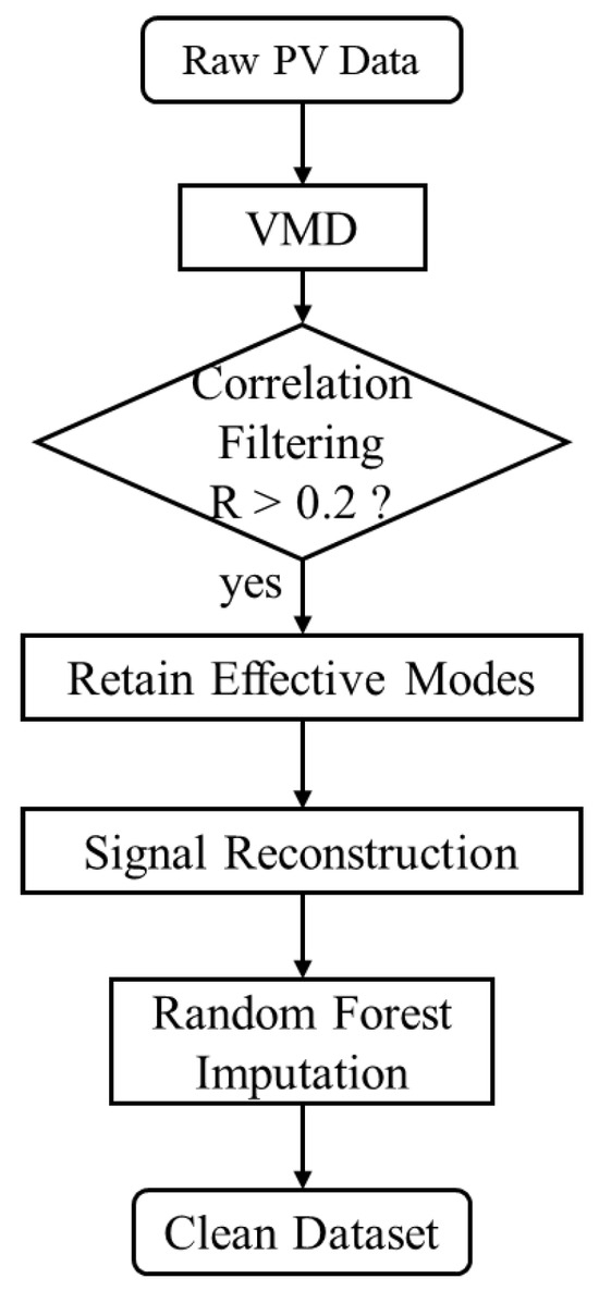 Figure 1 clearly illustrates the complete workflow: from raw data input through VMD, IMF screening based on correlation coefficients, to missing value imputation using random forest.