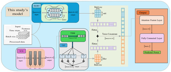 At present, PV power prediction models generally focus on the spatiotemporal characteristics of weather and PV output, and while deep learning methods have achieved remarkable progress, issues related to prediction accuracy, computational efficiency, and generalization still leave room for improvement [14,15]. Building on the above research, this paper proposes an innovative parallel hybrid model named TCN-TST-BiGRU. The core advantage of this model lies in its symmetric parallel architecture, which synergistically leverages the strengths of different models. Specifically, one branch utilizes TCN to capture local dynamic features of time series, while combining TST to efficiently model long-term dependencies. The introduction of TST is one of the key innovations in this paper. Its temporal shift module achieves information exchange between adjacent time steps at minimal computational cost through feature movement in the temporal dimension, effectively capturing the rapid fluctuations of photovoltaic power. Meanwhile, its built-in multi-head self-attention mechanism establishes relationships between any two time points in the sequence, perfectly capturing long-term patterns such as the daily periodicity of photovoltaic power. The other branch employs bidirectional gated recurrent units (BiGRU) to capture forward and backward contextual information from a global perspective. This dual-branch symmetric design ensures the model does not favor any single type of feature, but comprehensively understands photovoltaic power sequences from multiple dimensions including local–global and short-term–long-term perspectives, thereby significantly improving prediction accuracy and robustness.