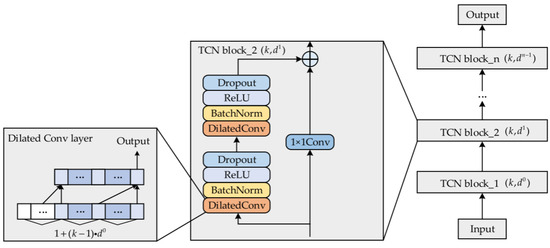 Here, denotes the number of expanded causal convolution layers. By adjusting the values of and , the receptive field can be significantly expanded to extract long-term temporal features from input data while maintaining a relatively shallow network architecture. Given a one-dimensional input sequence X, = {,,···,}, and an dimensional convolutional filter = {, ,···, }, the expanded causal convolution result at time step t can be expressed by Equation (9) [21,22,23]: