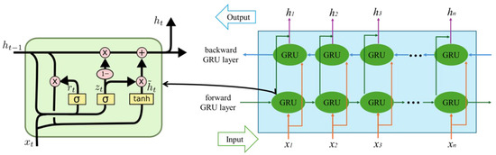 Bidirectional Gated Recurrent Unit (BiGRU) employs reset gates and update gates to realize a gating mechanism that dynamically regulates the flow of temporal information. The reset gate controls the degree of association between the current input and the historical state, while the update gate determines whether the previous memory should be retained. This gating design significantly enhances the efficiency of modeling complex temporal dependencies [25,26,27]. The BiGRU architecture consists of an input layer, a forward GRU layer, a backward GRU layer, and an output layer. At each time step, the input layer simultaneously passes data to both the forward and backward GRU layers, allowing information to flow in two opposite directions. The output sequence is jointly determined by the two GRU networks, enabling the model to capture both past and future dependencies. The overall network structure of BiGRU is illustrated in Figure 4.