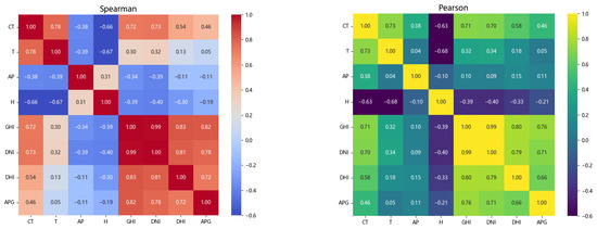 In Figure 6, the Spearman correlation coefficients show that module temperature, global horizontal irradiance, direct normal irradiance, and diffuse horizontal irradiance exhibit moderate to strong correlations, with values of 0.46, 0.82, 0.78, and 0.72, respectively. Similarly, in the Pearson correlation coefficient plot, module temperature, global horizontal irradiance, direct normal irradiance, and diffuse horizontal irradiance also display moderate to strong correlations, with coefficients of 0.46, 0.76, 0.71, and 0.66, respectively. Considering the physical mechanisms of solar radiation and meteorological variables, and based on the dual analysis of both Pearson and Spearman correlation coefficients [30], module temperature (CT), global horizontal irradiance (GHI), direct normal irradiance (DNI), and diffuse horizontal irradiance (DHI) are selected as the model inputs.