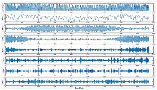 To ensure effective decomposition and accurate subsequent analysis, we carefully optimized and selected key parameters for VMD. The bandwidth constraint parameter (alpha) was set to 2000, aiming to moderately compress the bandwidth of each mode, thereby clearly distinguishing different frequency components while preventing loss of important fluctuation details due to excessive smoothing. The number of modes (K) is the most critical parameter in VMD. Through exploratory experiments, we found that when K < 7, the decomposition is insufficient, while K > 7 begins to exhibit noticeable “mode aliasing” phenomena. Therefore, we ultimately determined K = 7 as the optimal value to achieve the best balance between effective signal separation and avoiding mode aliasing. Additionally, we set the convergence tolerance (tol) to 1 × 10−7 to ensure the algorithm converges to sufficiently precise results.