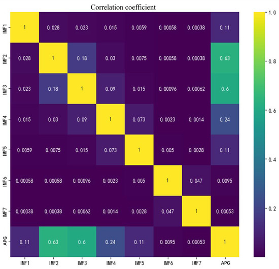Using VMD, the original sequence was decomposed into seven modes, as illustrated in Figure 7. However, the use of traditional VMD in sequence feature extraction often results in considerable accuracy loss. Therefore, after decomposing the original data into multiple IMF components, the correlation between each mode and the original sequence is calculated, and weakly correlated or uncorrelated IMFs are removed.