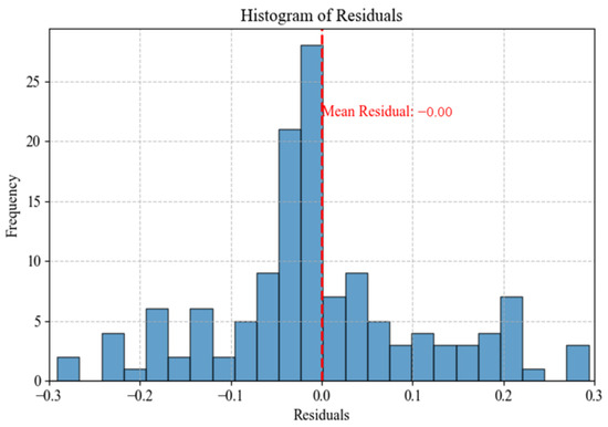 To investigate the effectiveness of the proposed model, a residual distribution histogram was plotted for deeper analysis, as shown in Figure 9. It can be observed from Figure 9 that most residuals are concentrated around zero, with a relatively uniform distribution and no significant bias. This indicates that the model’s prediction errors are relatively balanced within the positive and negative ranges, and the overall predictions are unbiased. Furthermore, the residuals exhibit an approximately normal distribution, suggesting that the model effectively captures the random fluctuations in the data without apparent systematic bias, thereby providing strong evidence for its high prediction accuracy.