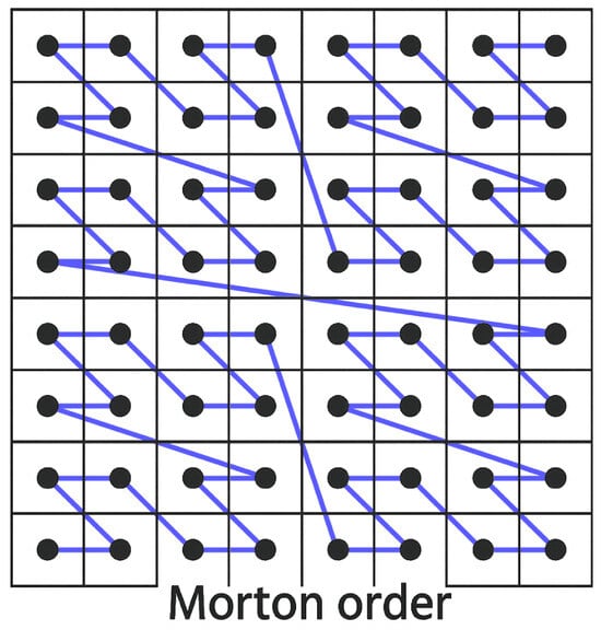 To address the limitations of marginal processing, pixel values can be treated as multidimensional vectors, and a vector ordering must be defined. A fundamental concept for mapping multidimensional data to a single dimension while preserving spatial locality is the Morton order (also known as Z-order) []. In this scheme, the bits of the coordinates of a point in a multidimensional space are interleaved to form a single number, ensuring that points close in the original space remain close in the one-dimensional sequence, as illustrated in Figure 1.