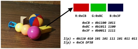 where , , and denote the j-th bit (from most significant, , to least significant, ) of the green, red, and blue channels, respectively. Each consecutive triplet of bits in the resulting 24-bit value, therefore, consists of one green, one red, and one blue bit in descending order of perceptual significance. The encoding procedure is illustrated in Figure 3.