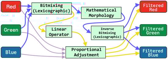 In contrast, Figure 5 outlines the proposed bitmixing framework. This framework features a dual-path strategy: (i) a direct path for applying standard morphological operators to the encoded scalar image, and (ii) a proportional adjustment path for linear operations, ensuring color fidelity as described previously.