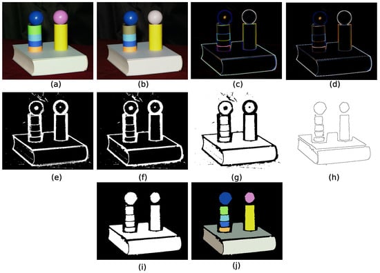 - Edge image generation: Finally, an edge image was generated where regions are represented by 1 and edges by 0, and each segmented region in the mask was filled with the average color of its corresponding pixels in the original image, resulting in the final segmented color image (Figure 7i). The Figure 7j is a mask obtained between the original image and the image in Figure 7i.