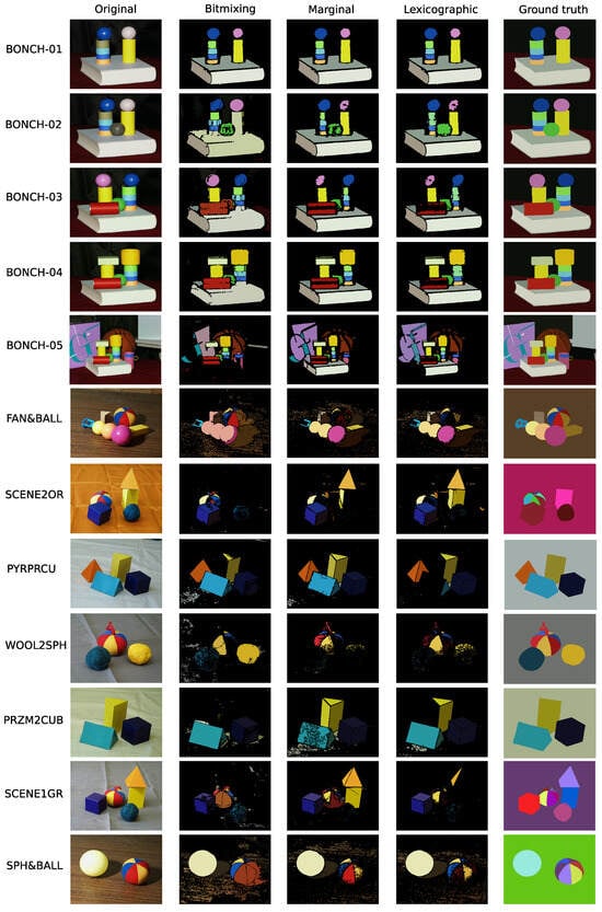 An experimental evaluation is conducted to assess the segmentation performance of the bitmixing, lexicographic, and marginal methods against Ground Truth (GT) images using a publicly available color image database [] (IITP-close and IITP-diffuse folders provide 12 pictures in BMP format, https://github.com/Visillect/colorsegdataset/tree/master, accessed on 30 September 2025). This set of 12 images is non-overdetailed; hence there will be a better visual interpretation after segmentation. The segmentation is performed using identical parameters for the lexicographic, marginal, and bitmixing methods. Thus, the generation of new contours is detected by comparing the Jaccard and Dice indices against the GT images. The technique with the highest Dice and Jaccard indices demonstrates superior accuracy in preserving the spatial boundaries and extent of regions. While these metrics primarily assess geometric alignment with the ground truth, they indirectly reflect the method’s ability to maintain coherent color regions, as accurate segmentation typically prevents color fragmentation and boundary artifacts. It is noteworthy to mention two things: (i) The lexicographic, marginal, and bitmixing methods process the images directly in RGB space. This is why these methods are compared, and (ii) the goal of the experiment is not to obtain beautiful segmentation; instead, the goal is to apply the same parameters and identify which segmentation best preserves colors and regions. For this, the application of the exact parameters is required.