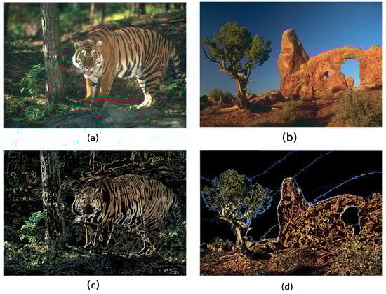 The Figure 10 illustrates the application of the internal gradient size on images with complex texture using the bitmixing algorithm. Original images are in Figure 10a,b. The contours identification is displayed in Figure 10c,d, respectively. Despite the large amount of information, the contours are detected adequately. It is noteworthy to mention that images in Figure 10a,b do not belong to the dataset used to compare the bitmixing algorithm.