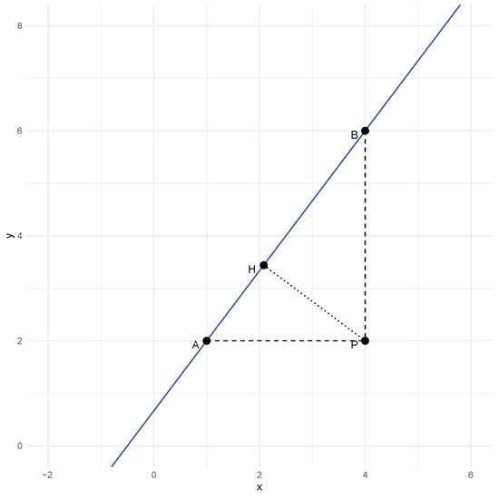 for . This is equivalent to the minimization of the sum of the areas of the ABP triangles in Figure 1 generated from the projections of the points on the line. We further note that GMR can also be obtained as the maximum agreement linear predictor maximizing the Lin’s concordance correlation coefficient [] between Y and its predicted value . The PR is obtained from the minimization of the sum of the arithmetic mean of the squared distances, so the criterion is