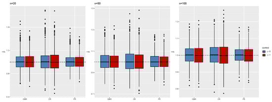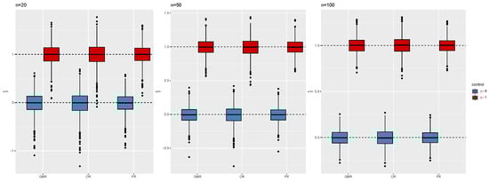 A second numerical experiment concerns data from the model in (13): the control variable is a dummy variable, based on which the sample is divided into equal sub-groups. The error structure is the same as above. We set . Figure 7 shows the negligible bias of the estimates for the intercept and slopes in the two groups, provided, respectively, by and for all the considered symmetric regressions and sample sizes. Furthermore, we do not observe important differences between the methods in terms of RMSE, as displayed in Figure 8, meaning that GMR, PR, and OR still perform similarly, as expected under the simulation design involving constant and equal error variances. Table 4 provides empirical coverage of asymptotic Wald-type confidence intervals for the two slopes and and confidence regions for the pairs and based on leave-one-out jackknife and the normal approximation. The results are quite satisfactory, with OR providing better results for inference on , in particular as the sample size grows.