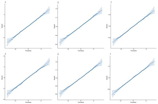 Normal QQ-plots from GMR, , , (top), and (bottom). The shaded area indicates 0.95-level confidence intervals.
