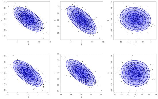 Paired joint distributions from GMR, , , (top), and (bottom). Gaussian contours overimposed for levels 0.25, 0.50, 0.75, 0.90, and 0.95.