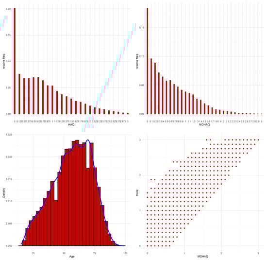 Our analysis is based on a sample of n = 43,522 patients from the DANBIO. We note that our sample size is much larger than the sample size of n = 13,391 from the study in []. The dataset contains the HAQ, MDHAQ, and age of the patient at the first visit where both HAQ and MDHAQ are available regardless of gender and diagnosis. Age is considered as a control variable when developing the conversion formula for the HAQ and MDHAQ scores. Summary statistics for the three variables are provided in Table 5. Their distributions are displayed in Figure 9: the relationship between the pair of measurements HAQ and MDHAQ is also illustrated in the bottom-right panel. We observe that the HAQ scores are larger on average than the MDHAQ scores. Looking at the quantiles, we notice that the distribution of the HAQ scores is shifted towards larger values compared to the distribution of the MDHAQ scores. There are not noticeable differences in variability. The bottom-right panel provides evidence supporting a linear relationship.