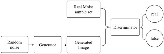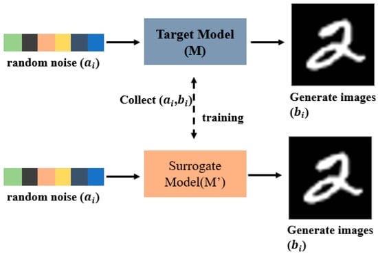 The flow of the surrogate modeling attack [,] is shown in Figure 1. For the image processing task, it is assumed that domain A consists of a large amount of 100-dimensional random noise, denoted as while domain B consists of data output from the original generation network, denoted as , where each pair of and is mapped one-to-one through a hidden transformation function Y. The goal of the image processing model M is to approximate the transformation Y by minimizing the distance L between and :