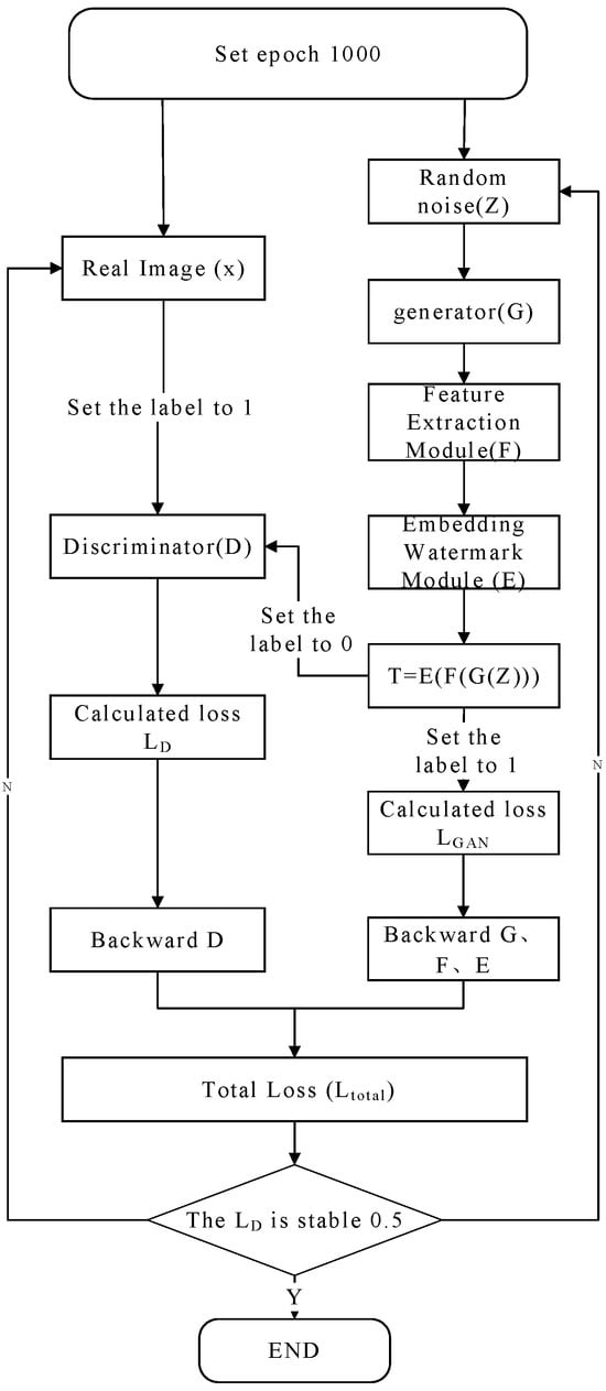 The flowchart of training strategy for DCGAN with the embedded watermark.