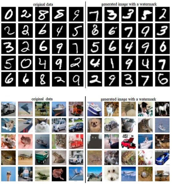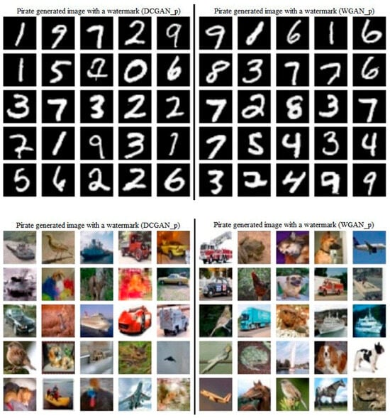 Compared with traditional approaches such as those in [,,], the proposed framework eliminates the need for specific trigger datasets in IP verification. Instead, ownership can be validated directly by extracting the embedded watermark from the outputs of a normally operating surrogate model, thereby significantly improving the flexibility and practicality of the verification process. However, it is worth noting that the current framework has been validated primarily on typical architectures such as DCGAN and WGAN, and its applicability to more complex or large-scale generative models (e.g., StyleGAN, Diffusion Models) remains to be further explored. Future work will focus on extending the proposed approach to high-resolution and multimodal generation tasks, and investigating watermark embedding strategies in the latent feature space to enhance cross-domain robustness and generalization.