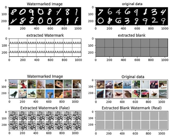 where and are hyperparameters that balance the two extraction losses and . The retrieval losses of watermarked information and watermark-free information and are illustrated as Formulas (10) and (11), respectively.